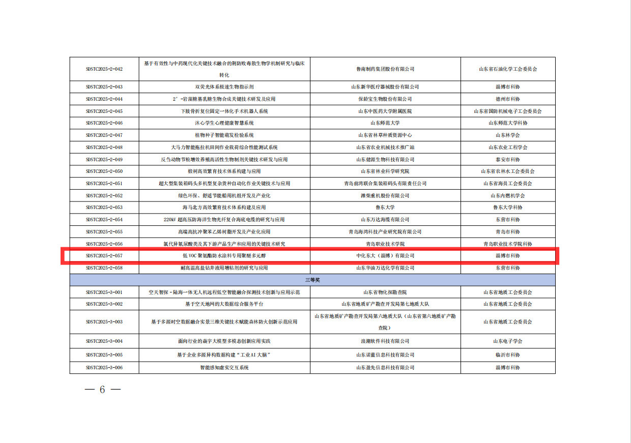 近日,第九届山东省科技工作者创新大赛圆满落幕,中化东大自主研发的“低VOC聚氨酯防水涂料专用聚醚多元醇技术”,凭借突破性创新与显著应用价值,从全省611个参赛项目中脱颖而出,荣获二等奖,为聚氨酯防水涂料领域技术升级再添新动能!