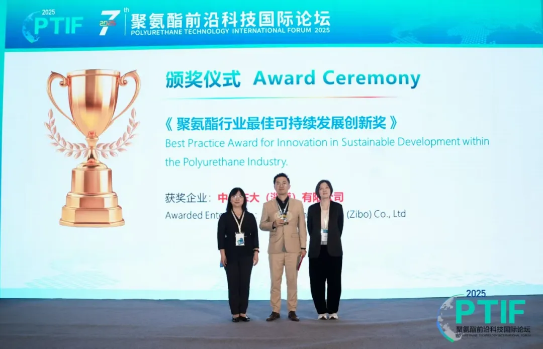 From June 26 to 27, 2025, the 7th International Forum on Polyurethane Frontier Technology (PTIF) was grandly held. Sinochem Dongda (Zibo) Co., Ltd. won the "Best Sustainable Development Innovation Award in the Polyurethane Industry" in recognition of its groundbreaking practices in green R&D and low-carbon production.